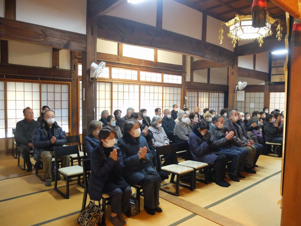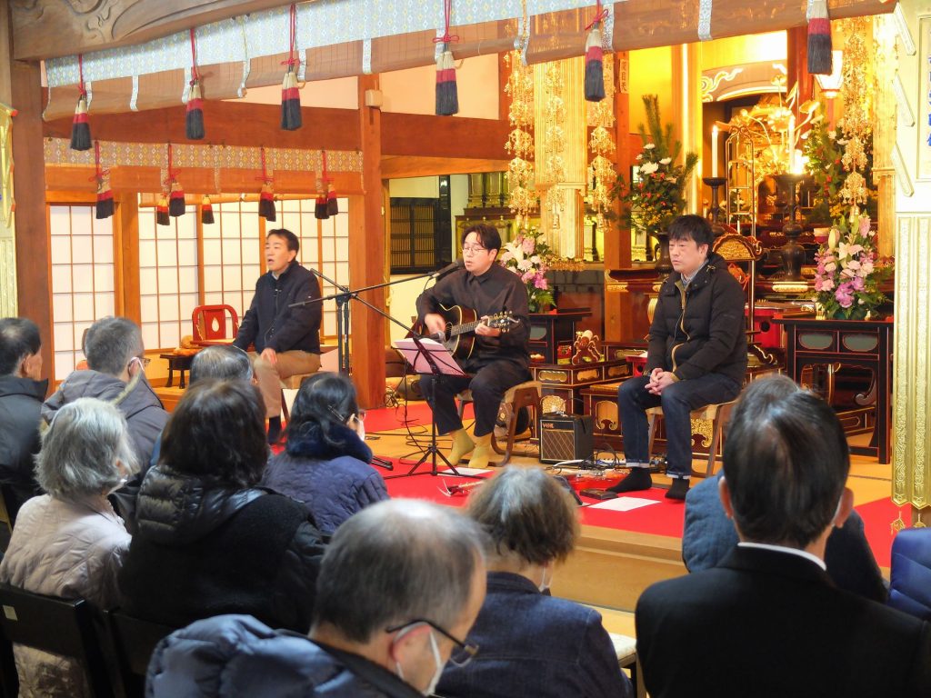 令和8年1月12日(祝)10:00~初念仏講を執り行いました。大雪の予報があり、心配していましたが天気に恵まれ無事に開催することが出来ました。寒い中にたくさんのご参詣をいただき有難うございました。令和8年になって初めての法要で、新年を迎えて新たな気持ちでお念仏を皆様と共にお唱えし、新しい年がいい年でありますようにと祈念いたしました。法要の後は、THE TAXMANによる寺コンサートを行い、皆さんで楽しい音楽のひと時を過ごすことが出来ました。